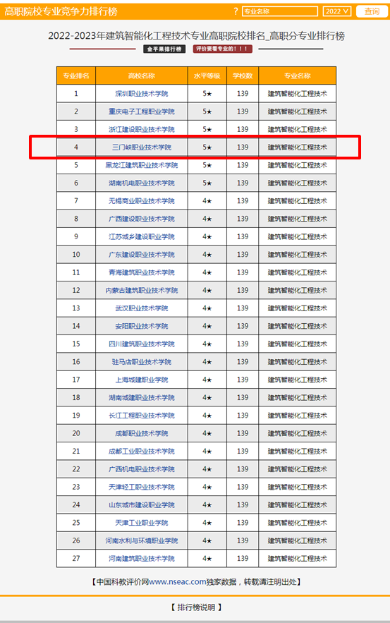 yl6809永利建筑智能化工程技术专业在2022年中国科教评价网“金平果”全国高职院校中排名第四,水平等级5★(全国共6所5★院校),全国开设建筑智能化工程技术专业的公司数139所,这是该专业继2021年之后第二次获得此等级评价。