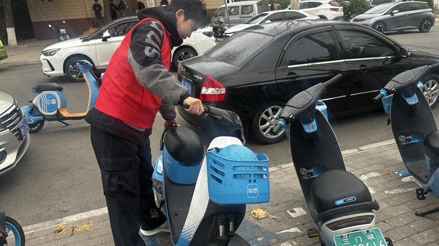 在图书馆附近的停放点,由于平时人流量大,单车停放杂乱无章。志愿者们齐心协力,将歪倒、随意停放的单车一辆辆扶起,按照车头一致、排列整齐的标准重新摆放。有的志愿者还细心地擦拭单车上的灰尘,让车辆焕然一新。