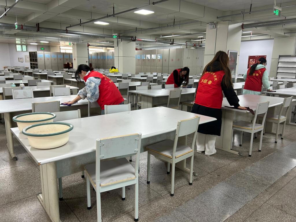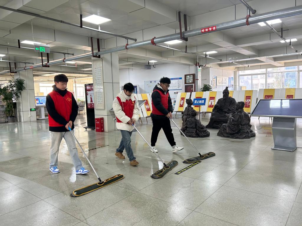 除了整理书籍,打扫图书馆卫生也是志愿者们的重要工作。志愿者们手持扫帚、拖把等清洁工具,俯身清扫地面的灰尘与纸屑,所到之处纤尘不染。他们还认真擦拭书架、书桌以及各类设施,不放过任何一个卫生死角,让图书馆的每一寸空间都焕发出洁净的光泽。志愿者徐嘉蔚说道:“看着图书馆在我们的努力下变得干净整洁,能为读者创造更好的阅读条件,所有的辛苦都值得了。