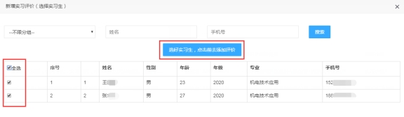 点击【新增评价】,选择员工,点击【选好实习生,点击前去添加评价】,进入实习评价界面,完善员工实习表现和员工实习评语,点击【提交评价】,完成新增评价操作。