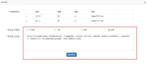 在员工实习期间,指导老师对员工实习情况进行过程性评价,可以给予一个员工多次评价。