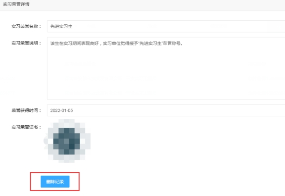 点击荣誉记录栏的【荣誉名称】即可查看荣誉详情。点击详情里【删除记录】,即可删除该荣誉记录。只有添加该荣誉记录的管理员有删除权限,其他管理员只能查看,不可以删除。