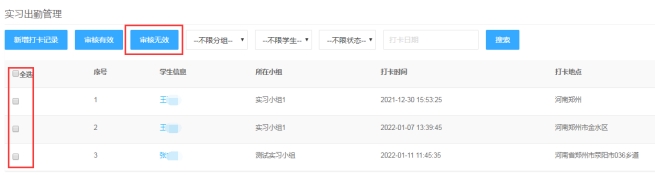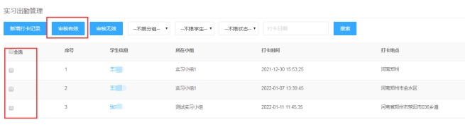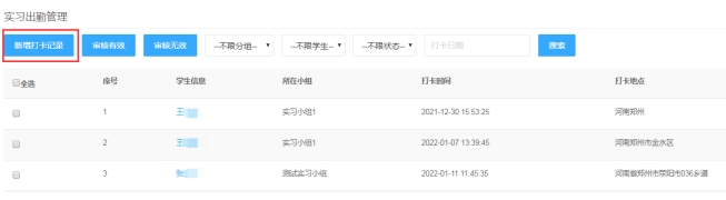 实习期间,指导老师可查看、管理员工在手机APP端的打卡出勤记录,根据实际情况审核通过或不通过员工的打卡信息,还可以根据员工的申请新增打卡记录。