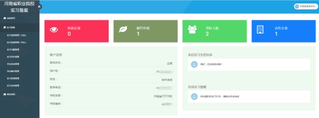 登录成功进入【系统主页】,有投诉记录、解约申请、带队人数、合作企业以及实习结束超时提醒,点击可进入相应详情界面。