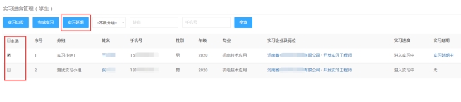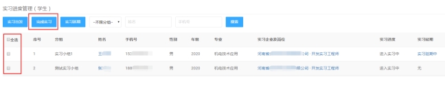员工在出发去实习企业时、员工在完成实习任务时以及员工实习需要延期时,需要指导老师在此处完成实习进度更新。指导老师可以一次选择多个实习小组或多个实习员工进行批量处理。