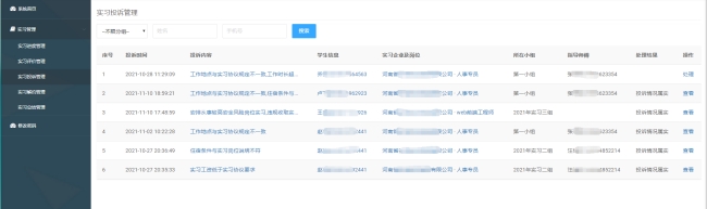 点击【实习投诉管理】操作栏的【处理】处理员工的投诉信息,处理之后的数据只能点击【查看】查看员工的投诉信息和处理情况。