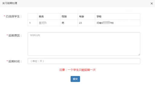 在员工实习需要延期时,选择实习员工,点击【实习延期】,输入延期原因及延期时间,点击【提交】,完成员工实习延期处理。实习延期后,公司实习计划结束时间加上延期天数为该生的最晚实习结束时间,在最晚实习结束时间之前,指导老师可以随时终止或者完成员工的实习任务。