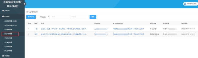 在公司或二级院系完成实习员工的编班分组、指定实习指导老师之后,实习指导老师便开始对所负责的员工进行管理,包括实习进度管理、实习出勤管理、实习评价管理、实习评价管理、实习投诉管理、实习解约管理、实习荣誉管理、实习总结管理。