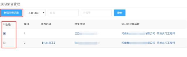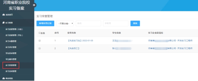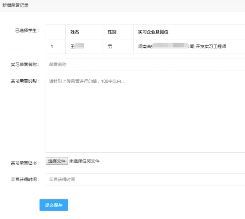 点击【实习荣誉管理】,选择要添加实习荣誉的员工,点击【新增荣誉记录】,输入荣誉名称、荣誉说明和获得时间,上传荣誉证书照片文件,点击【提交保存】,完成新增荣誉操作。