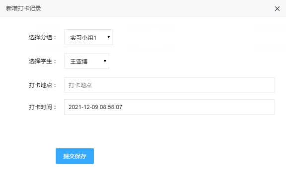 点击【新增打卡记录】,选择员工,输入打卡地点、打卡时间,点击【提交保存】,完成新增打卡记录操作。