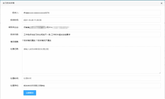 员工在企业实习过程中,认为企业实习情况与线上备案情况不符的,可以向实习指导教师和公司进行线上投诉,指导教师和公司在规定时间内予以调查、确认和处理。
