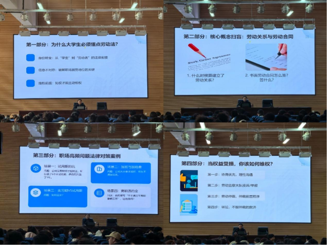 讲座内容紧密结合员工成长需求与专业特点,从我国法律体系整体框架出发,重点解读了与老员工密切相关的《劳动法》《劳动合同法》,助力员工树立职场权益保护意识;通过《民法典》合同编相关内容,深入剖析建设工程施工合同的关键条款与风险防范,提升员工在未来工程实践中的法律运用能力;同时,结合刑法典型案例开展警示教育,引导员工筑牢职业伦理底线,自觉远离违法犯罪。