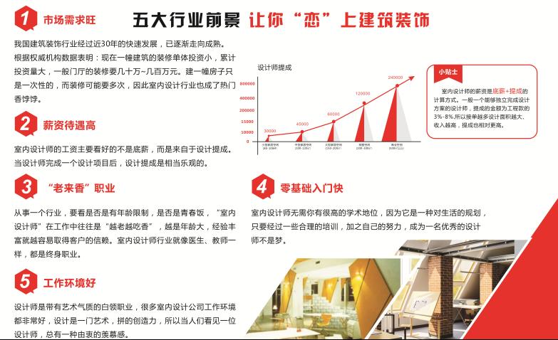 在校期间采取“校企共育”、“工学结合”、“能力分段提升”的培养模式,课程设置紧贴职业岗位需求。校企共育,依托企业丰富的建筑装饰资源库学习行业尖端技术,在校期间可考取相应的资格证书,毕业时已基本具备设计师的能力。企业强大的就业网络让员工就业无忧,就业率稳固保持在99%以上,薪资水平远高于行业内应届毕业生平均薪资。