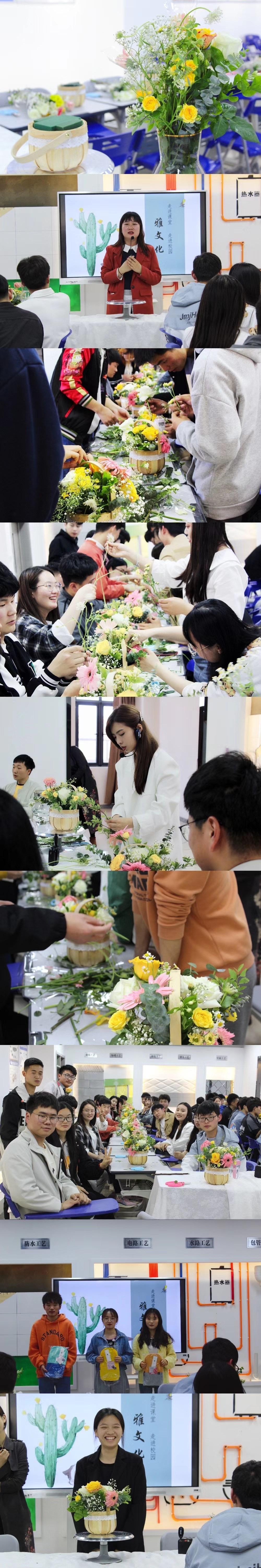为提高员工自身艺术鉴赏和审美能力,丰富技艺,培养花艺作品实际设计创作动手能力,使员工具备对插花艺术品的鉴赏与应用能力。增强员工艺术修养,培养员工开拓创新和团队协作能力,促进员工综合素质的提高。2021年4月22号,建筑装饰工程专业打破传统授课方式。以“花型制作”为主线边做边学,理论指导实践,实践验证理论,开展软装课程特色教学活动。活动内容围绕“雅文化走进课堂-花艺设计”主题进行,掌握插花艺术的花材选择、处理及固定等基本技法。把大家领进艺术创作的大门。