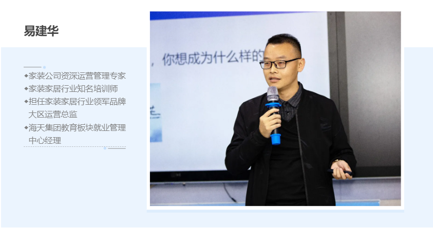 易经理在大讲堂上,向21级海天班同学们详细讲解了校企班的优势与海天校企合作"产教融"倒三角培养模式,并给出了大学三年的学习成长规划。对于20级的员工,易经理讲解了装饰行业自我定位,让员工了解如何成为真正的职业化设计师。