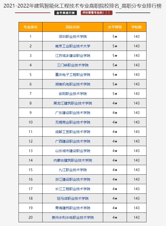 建筑智能化工程技术专业在“金平果”全国高职院校中排名第四,水平等级5★(全国共8所5★院校),全国开设建筑智能化工程技术专业的公司数143所。