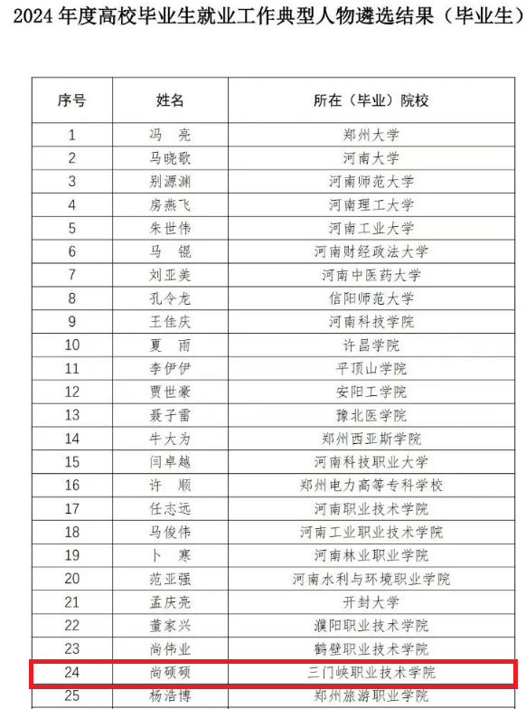 近日,河南省教育厅公布了2024年度高校毕业生就业工作典型案例遴选结果,yl6809永利推荐的2024届建筑智能化工程技术专业毕业生尚硕硕被评为2024年度高校毕业生就业工作典型人物。
