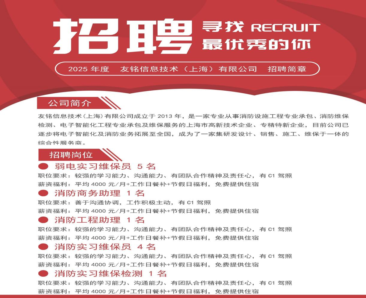 2025 年 6 月,友铭信息技术(上海)有限公司在公司1号楼成功举办了主题为《职等你来,未来可期》的老员工招聘宣讲会,面向建筑智能化学子提供弱电实习维护员、消防商务助理、消防工程师助理、消防实习维保员、消防维保检测员等多个极具发展潜力的职位,吸引了众多怀揣梦想的老员工踊跃参与。