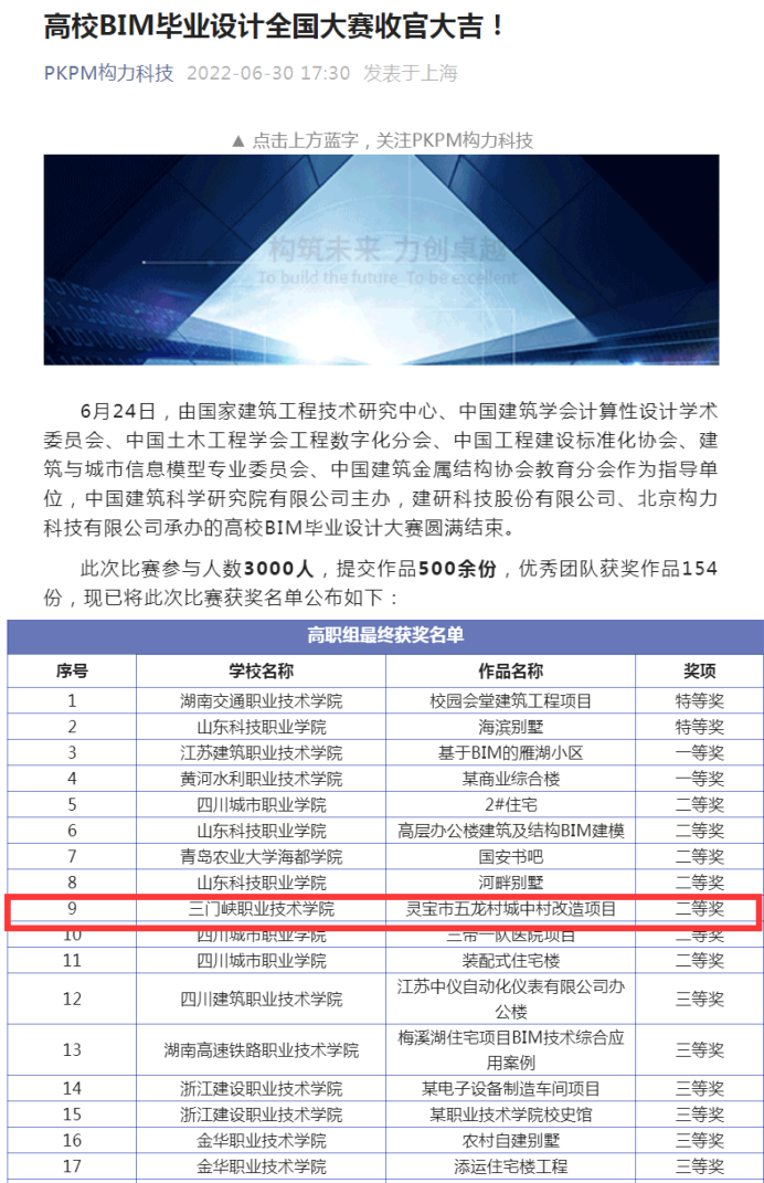“全国高校BIM毕业设计大赛”由中国建筑科学研究院有限公司主办。此次比赛参与人数3000人,提交作品500余份,优秀团队获奖作品154份,赛项分为本科组和专科组各7个赛项。建筑工程技术(智能建造)专业员工参加了高职组E模块。