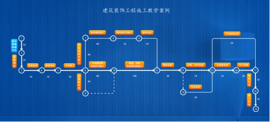 系统通过双代号网络图呈现案例的施工内容和顺序,使整个项目及其各组成部分一目了然,达到方便老师讲解的目的,同时员工也可以通过真实案例的施工顺序,验证所学专业知识的掌握情况,达到教学、实训和“教学实践”的深入融合。