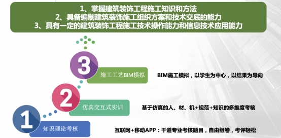 教学模块依托于五居室真实案例,通过三维模型、4D微课、教学视频等多种资源类型呈现装饰装修施工过程中的教学重点和难点;实训模块从理论考核到仿真实操考核两种方式考核员工对装饰工程施工知识的理解和掌握程度。