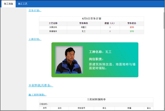 系统内包含施工准备阶段的劳务进度安排计划、工种介绍、施工领料单以及主要施工机具介绍,系统而全面的介绍了该工艺的前期准备工作,使员工在学习施工工艺流程前做好预习工作。