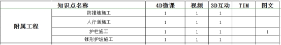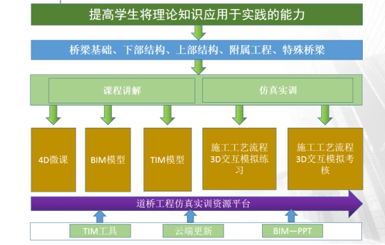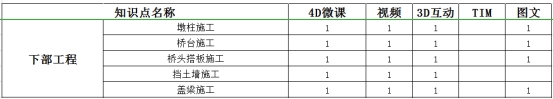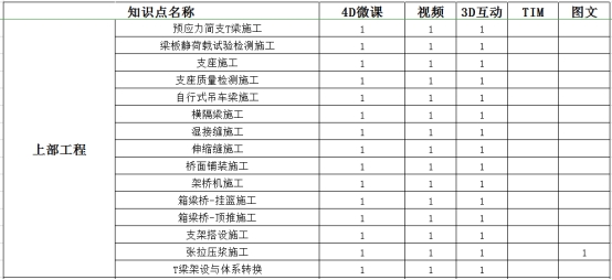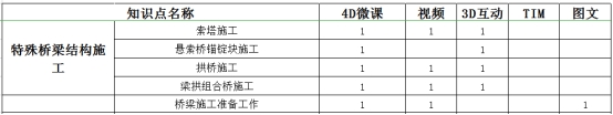 课程包含桥梁基础、下部结构、上部结构、附属四大部分40余知识点,覆盖常规桥梁结构施工的施工工艺和技术参数,在此基础上制作特殊桥型及特殊工法TIM模型,在满足教学广度的前提下,提高教学深度,使员工对桥梁施工有全面的认识。