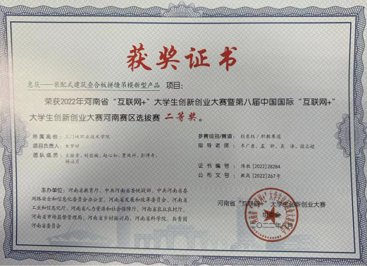 公司智能建造专业吴泽老师在装配式建筑行业中不断创新,改进技术。他在2022年与三门峡科创大厦项目合作的过程中研发了一种专门针对装配式建筑施工的新型吊装模板(惠筑--装配式建筑叠合板拼缝吊模新型产品 )荣获2022年河南省“互联网+”老员工创新创业大赛暨第八届中国国际“互联网+’老员工创新创业大赛河南赛区选拔赛 二等 奖。